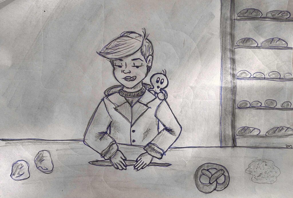 Wir fuhren mit den anderen Kindern aus der Gruppe mit dem Bus in den westlichen Stadtteil von Friedberg. Als wir aus dem Fahrzeug ausstiegen, wartete schon ein weiß gekleideter Mann mit einem Plastikhut, um den ein Gummiband gezogen war und begrüßte uns und unsere Kindergärtnerin herzlich: „Ja grüßt euch Gott. Ihr seid also die zukünftigen Bäcker. Kommt und folgt mir.“ Lautstark mit viel Gelächter zog also die Gruppe Kinder hinter dem weiß gekleideten Mann her. Nachdem wir die Eingangstüre passiert haben, drehte der Herr sich um und meinte: „So, junge Damen und Herren, jetzt mal Schluss mit dem Geschnatter. Wir werden jetzt mal ruhig zuhören und zusehen, wie man eine Brezel macht.