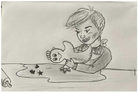 Moritz band sich eine bunte Schürze um und mir ein buntes Tuch. „Das brauchen wir, um nicht das ganze Mehl an der Kleidung zu haben.“ Die Mama hatte den Teig und ein Brett auf einen kleinen Tisch gestellt und einige Ausstechformen dazugelegt. Jetzt nahm Moritz ein rundes Holz und rollte es kreuz und quer über ein Stück Teig. „Jetzt nehmen wir eine Ausstechform und stechen Plätzchen aus.